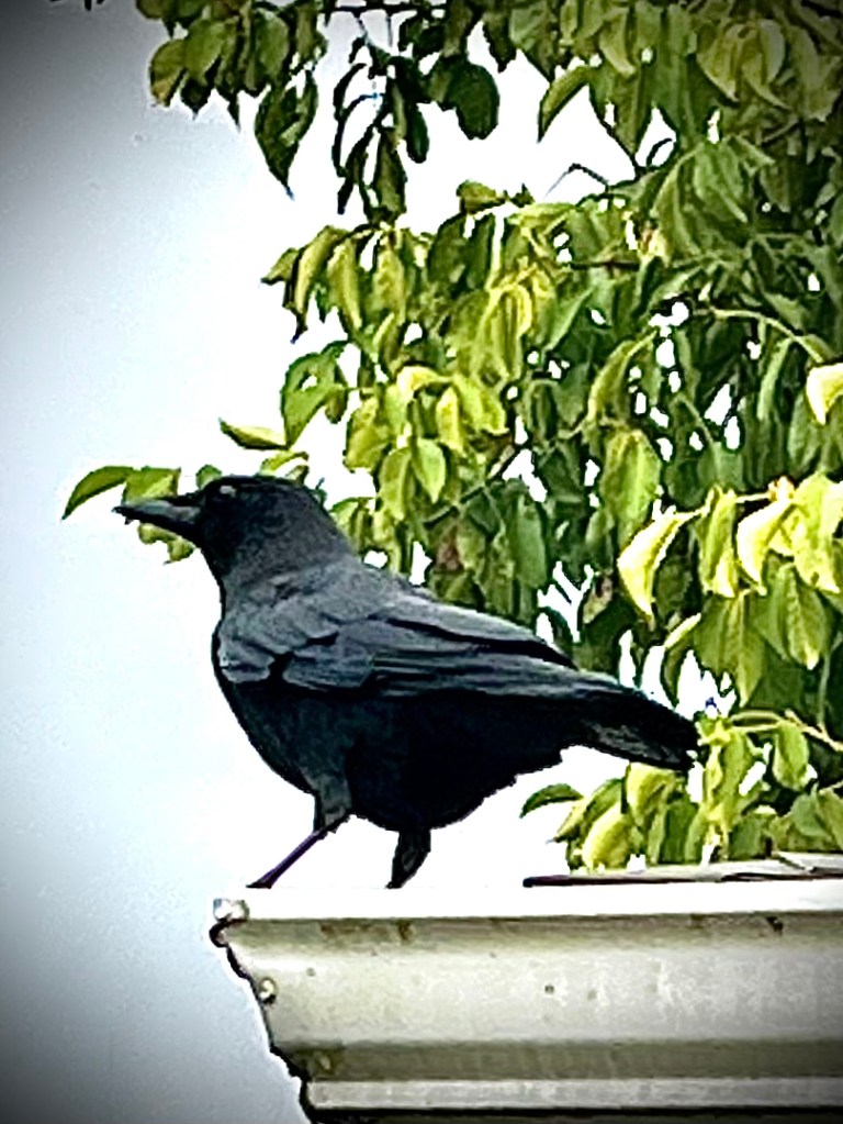just a large crow, pecking bugs out of the gutter.