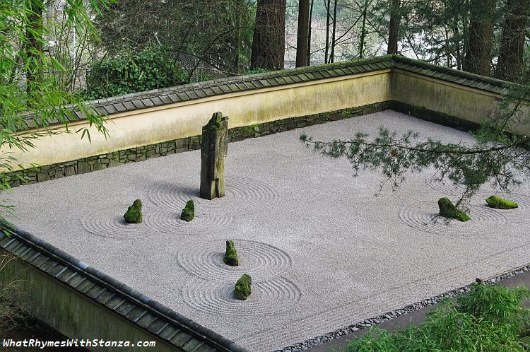 Tall vertical stones with their leaning rock consorts float within a sea of white sand and gravel raked to perfection into rippling waves in a contrastingly calm, even plane. This little garden, an oasis of zen energy, unassuming and nonsanctimonious, helps keep me afloat when I find myself tossed by waves of undisciplined thought, reminding me that I - like the garden - am an amalgam, not of sand and gravel and rock, but of body, mind and spirit; and that I, too, am perfectly patterned for my own even plane of unassuming and nonsanctimonious existence.